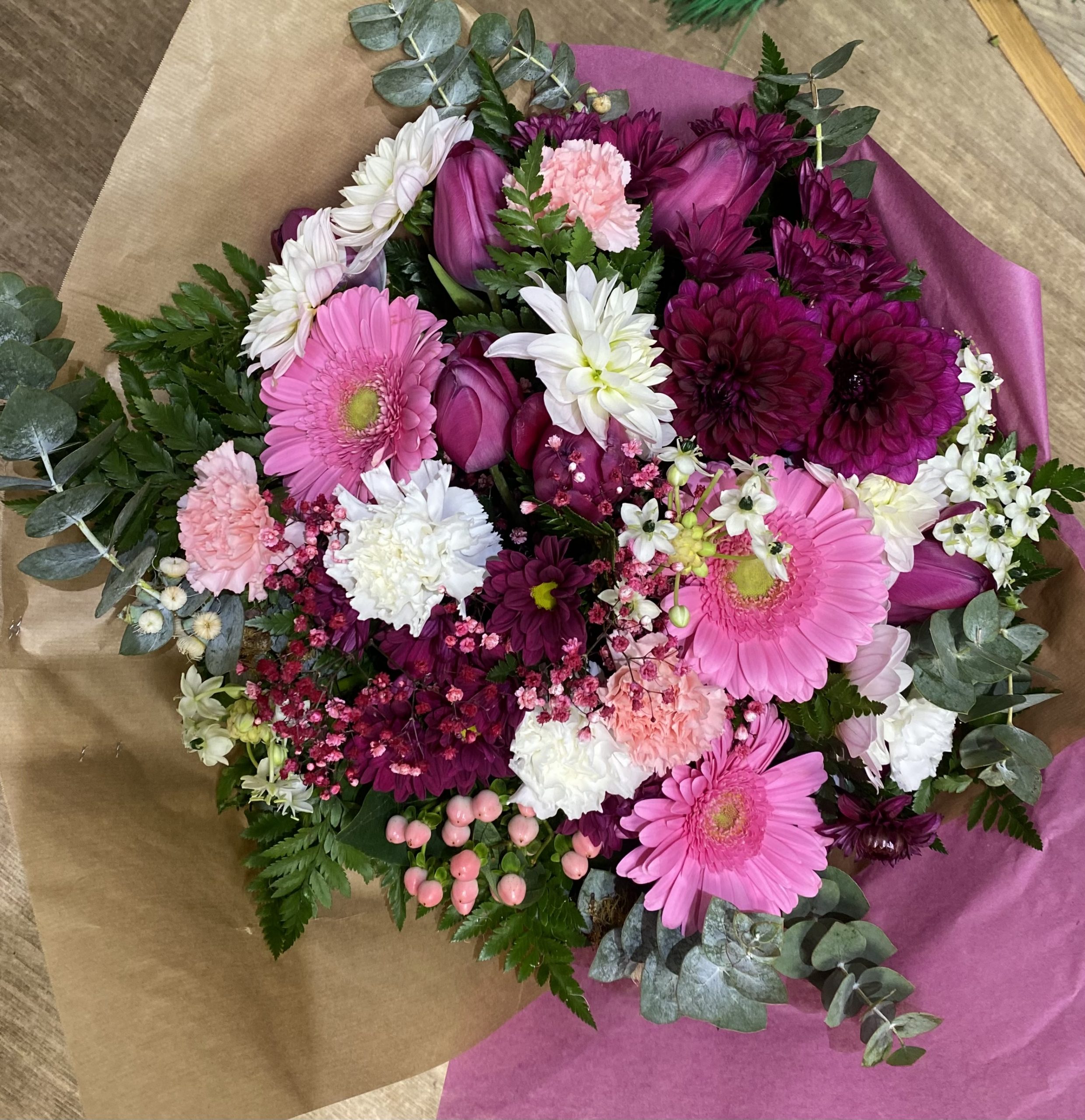 Bouquet rond de couleur fuchsia, blanc et rose .